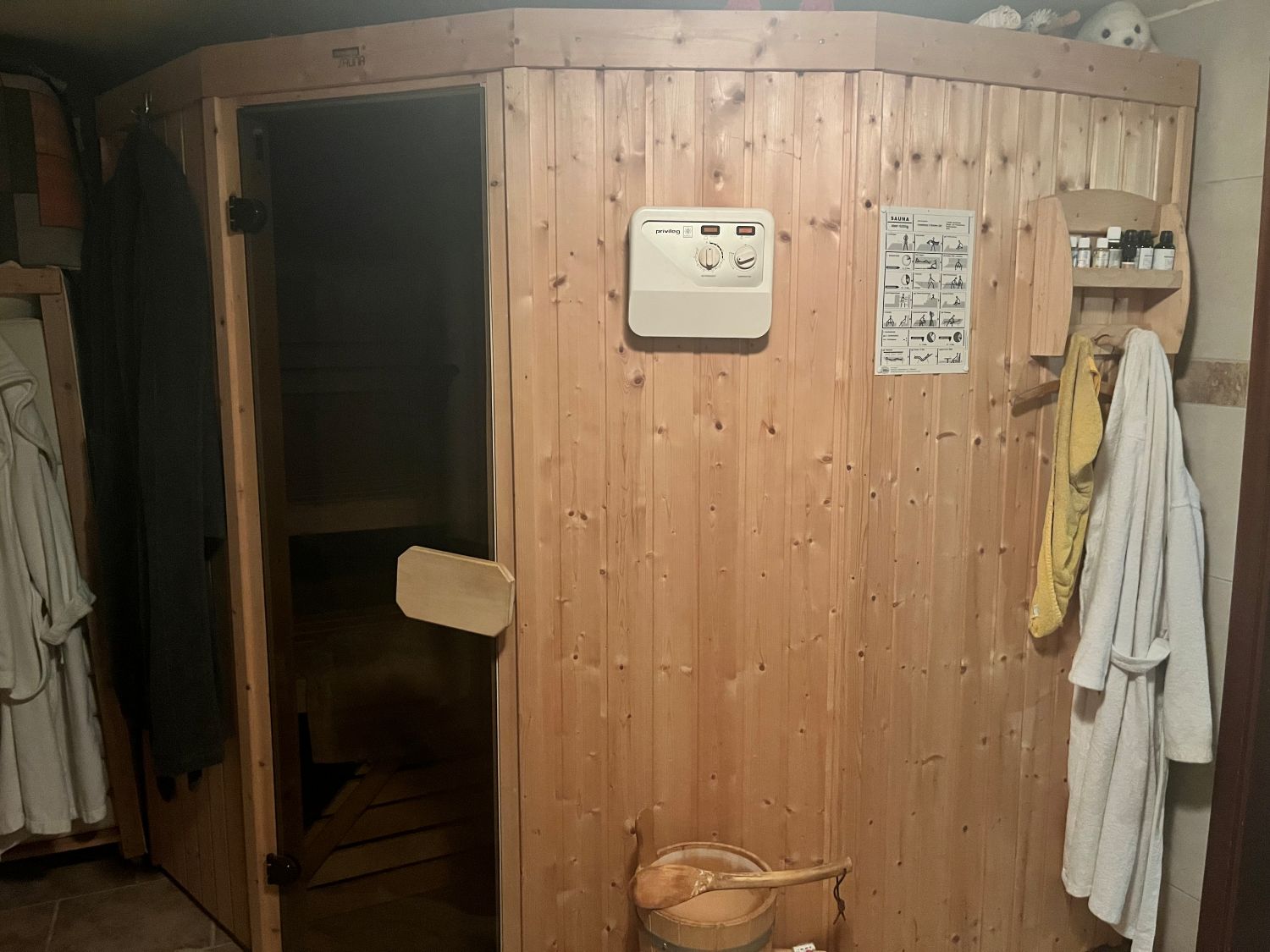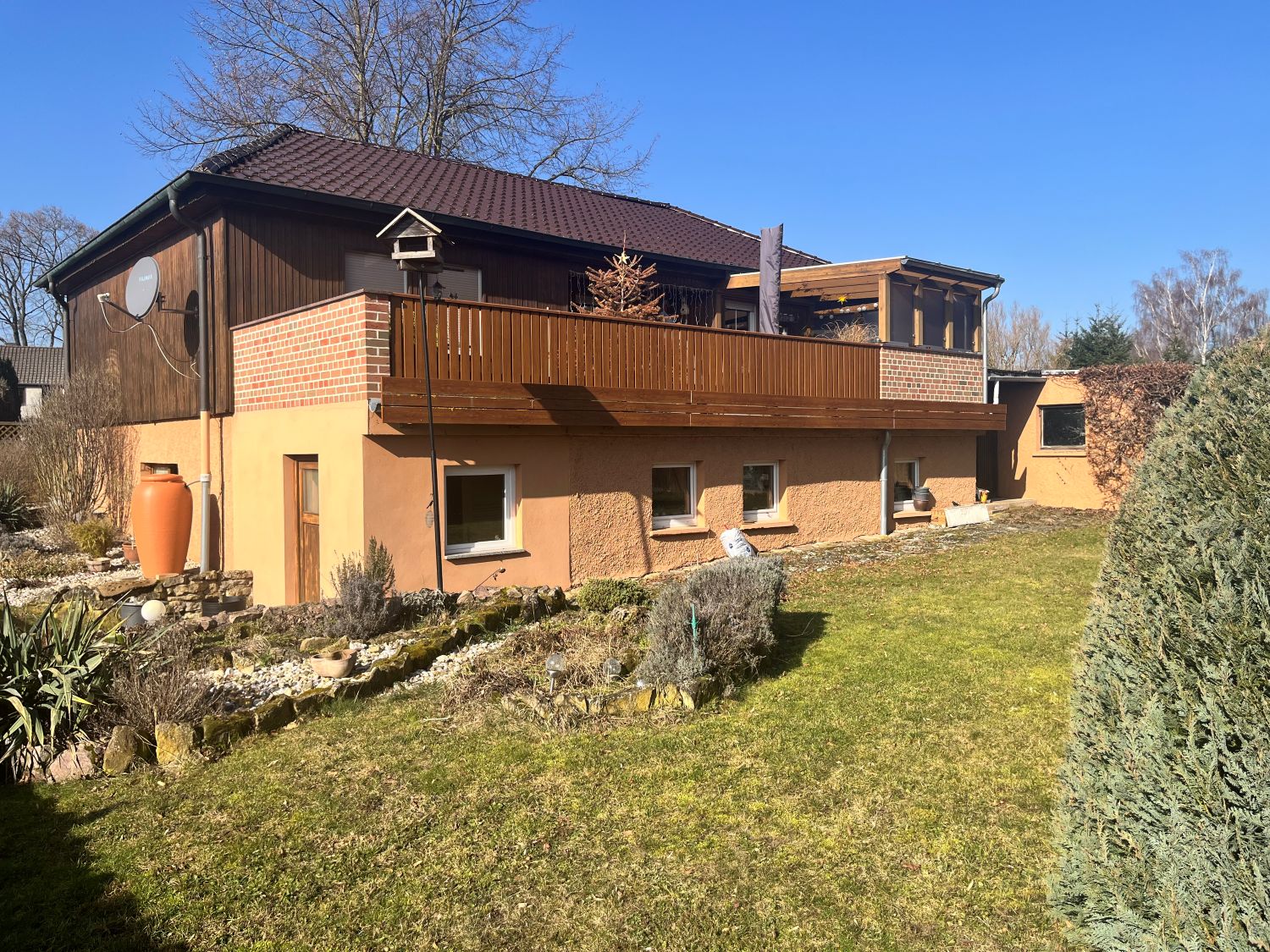 Im Erdgeschoss befinden sich auf ca. 100 m² Bad mit Dusche, Küche, Schlafzimmer, Arbeitszimmer und ein ca. 35 m² großes Wohnzimmer mit Zugang zur ca. 27 m² großen Terrasse. Im Untergeschoss sind dann weitere zwei Schlafzimmer, ein Bad mit Wanne, Waschraum, Sauna, Heizungsraum und Abstellräume sowie eine angebaute Garage.