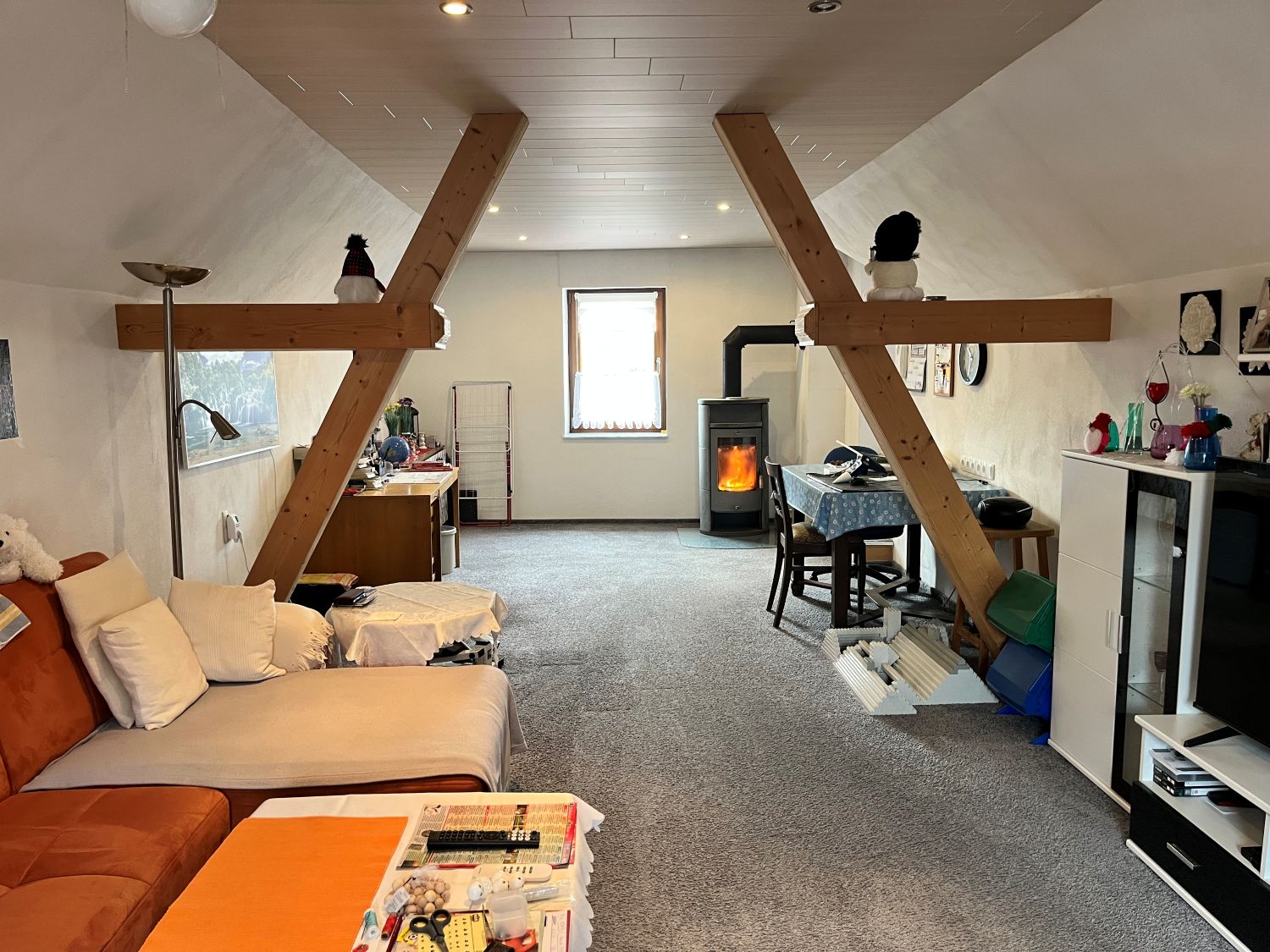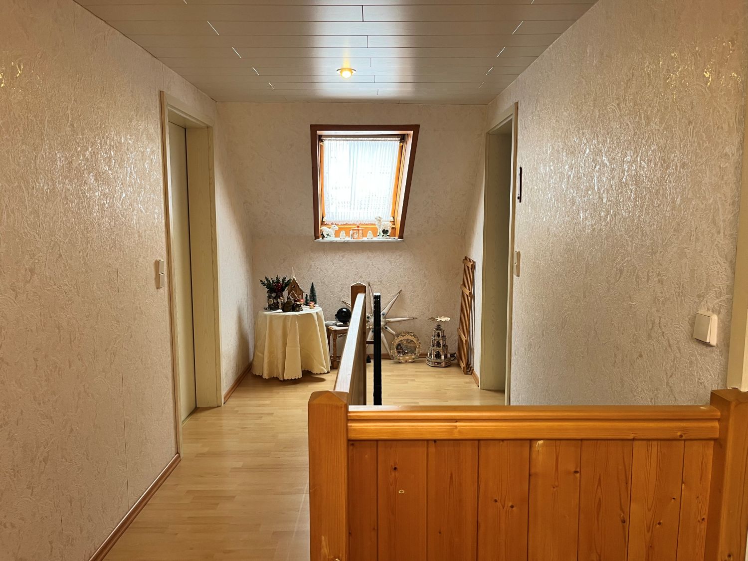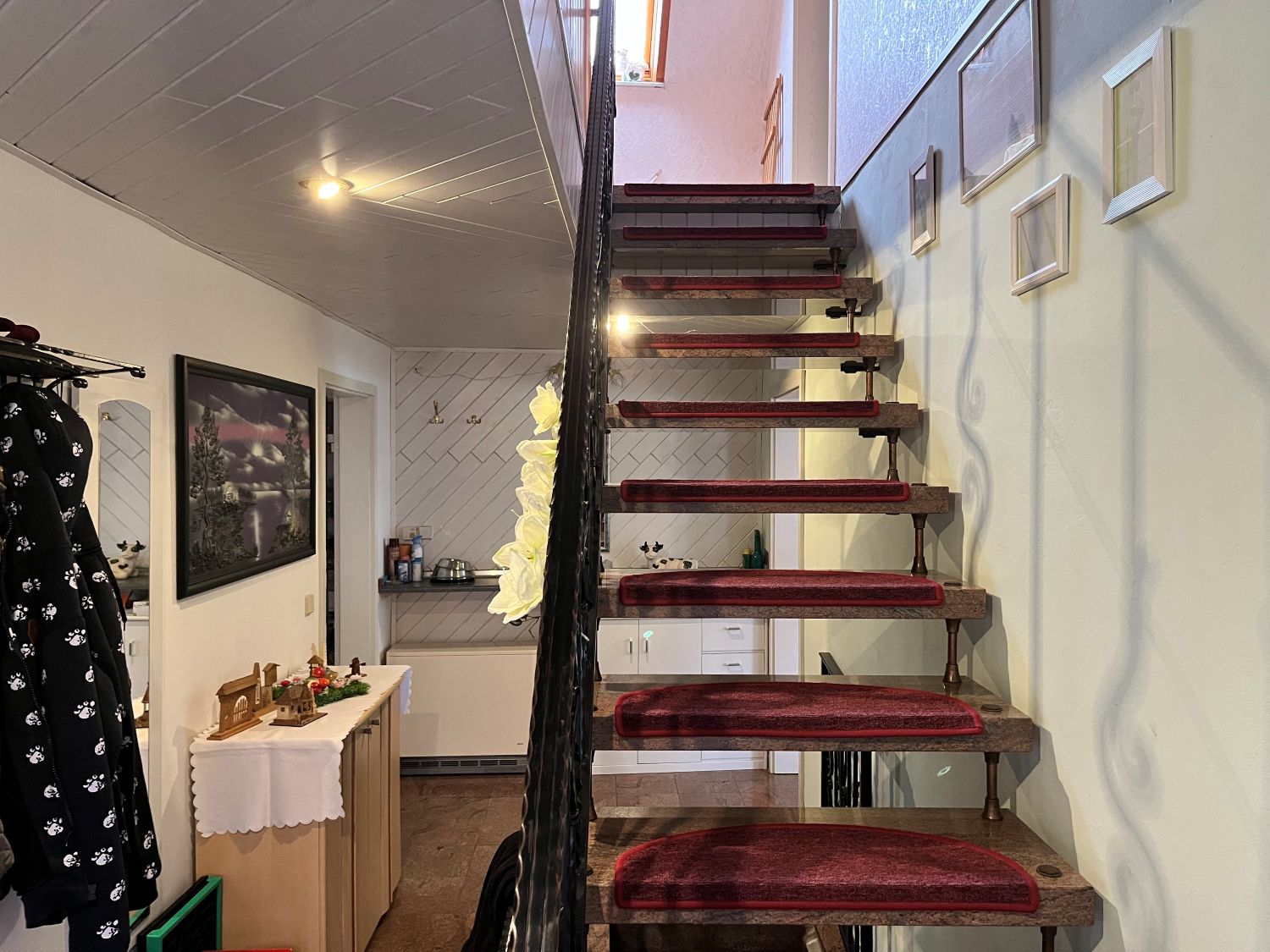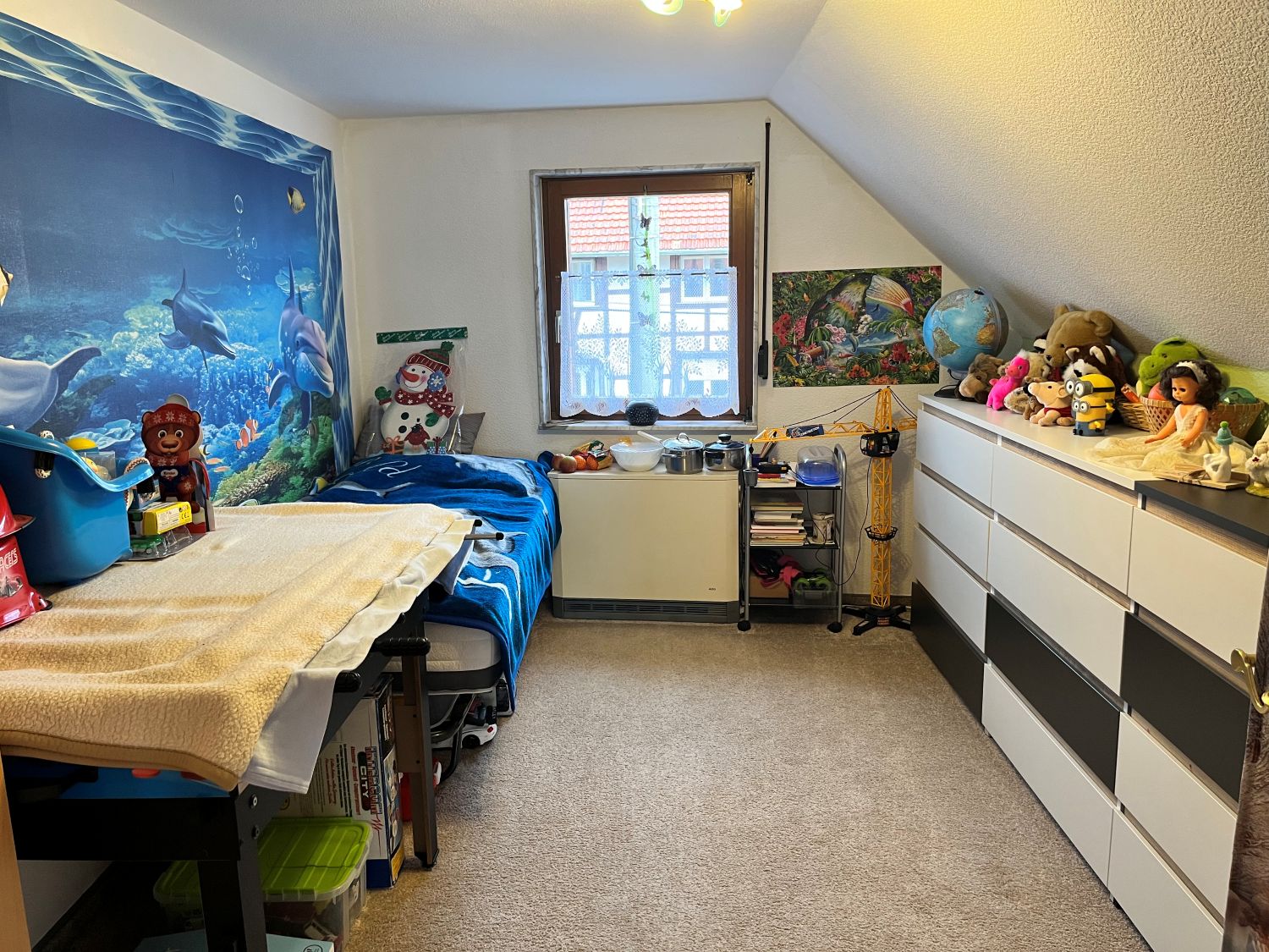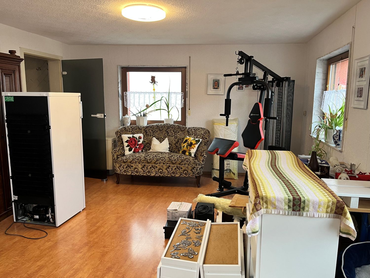 Im Erdgeschoss befindet dich ein ca. 23,30 m² großes Wohnzimmer, eine Küche Bad mit Wanne, Waschküche und Garage, im Obergeschoss sind dann das Schlafzimmer, zwei Kinderzimmer, eine weitere Küche und ein Bad mit Dusche sowie ein ca. 35 m² Wohnzimmer.