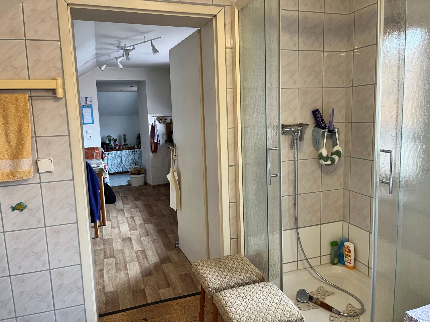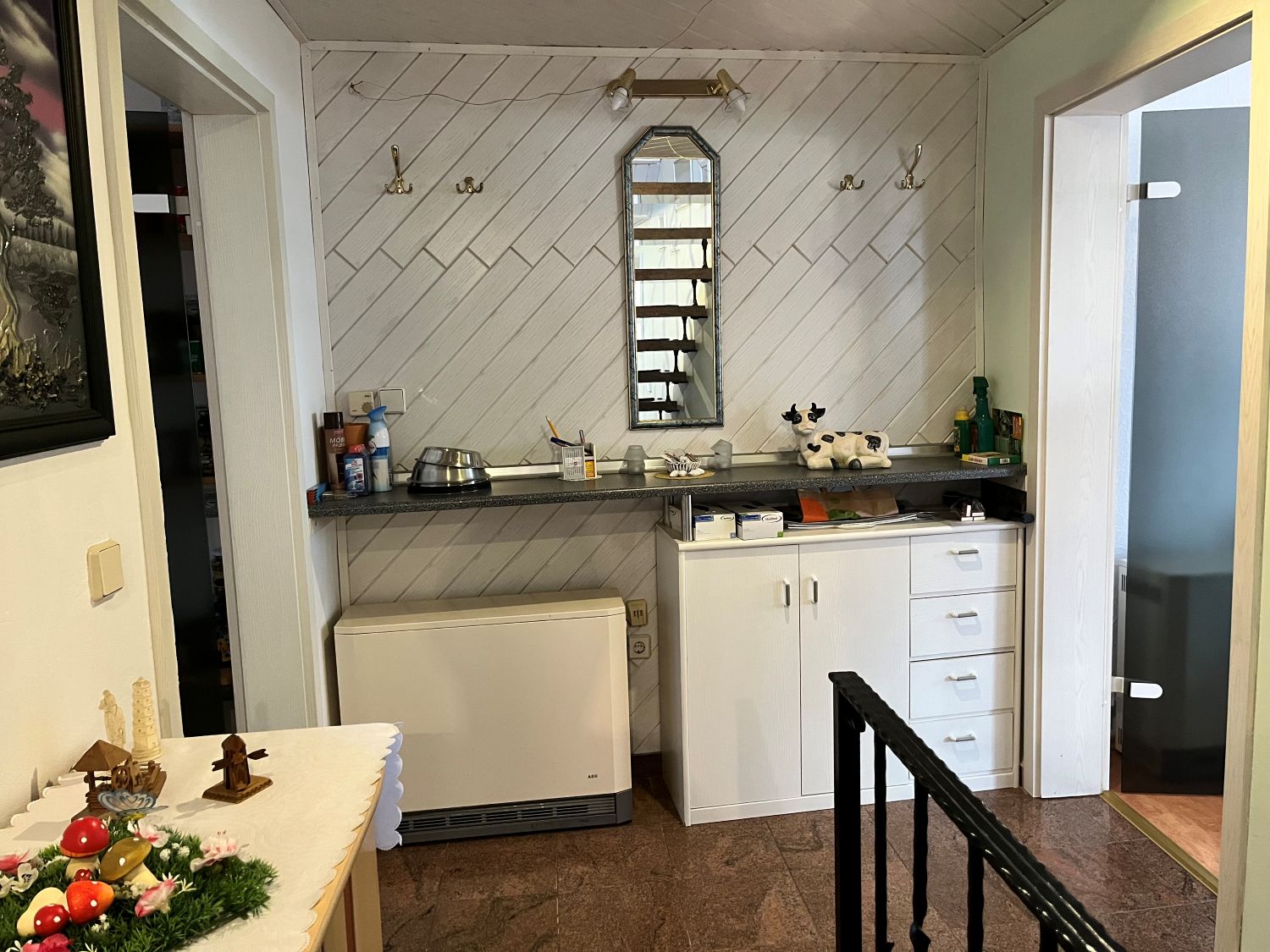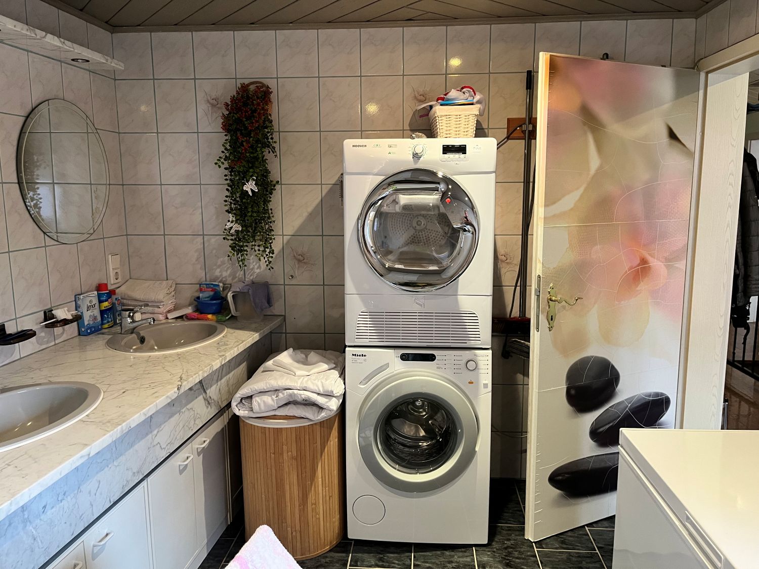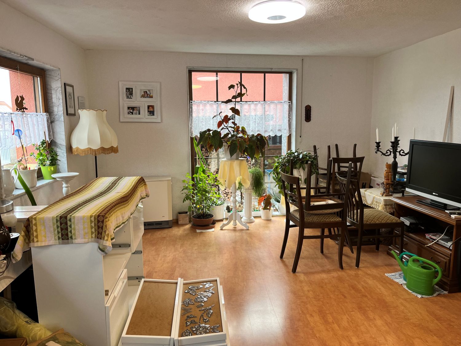 Im Erdgeschoss befindet dich ein ca. 23,30 m² großes Wohnzimmer, eine Küche Bad mit Wanne, Waschküche und Garage, im Obergeschoss sind dann das Schlafzimmer, zwei Kinderzimmer, eine weitere Küche und ein Bad mit Dusche sowie ein ca. 35 m² Wohnzimmer.