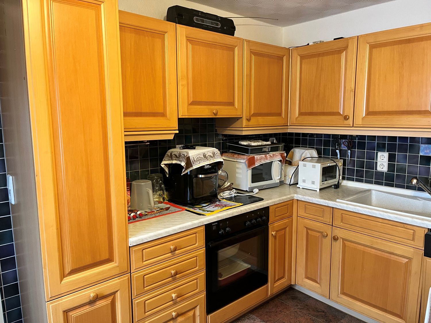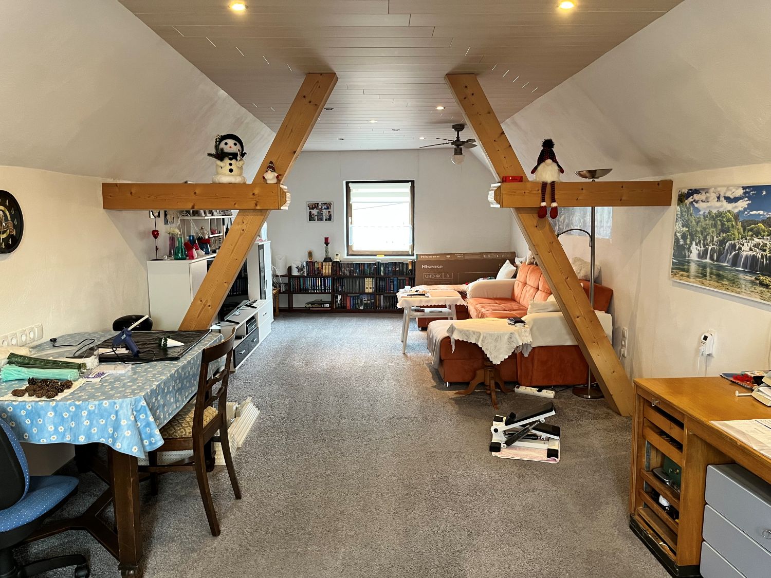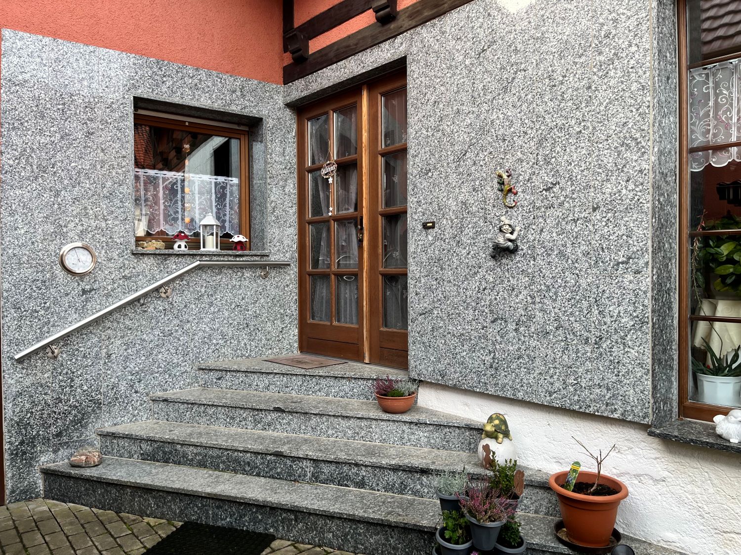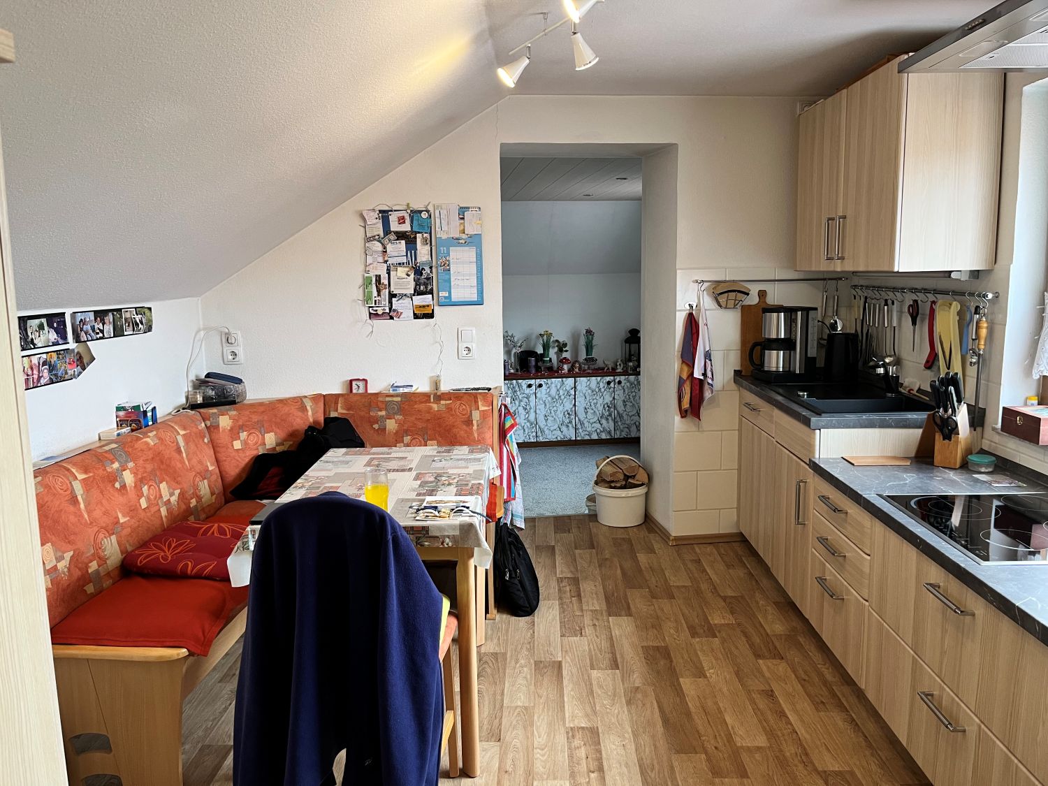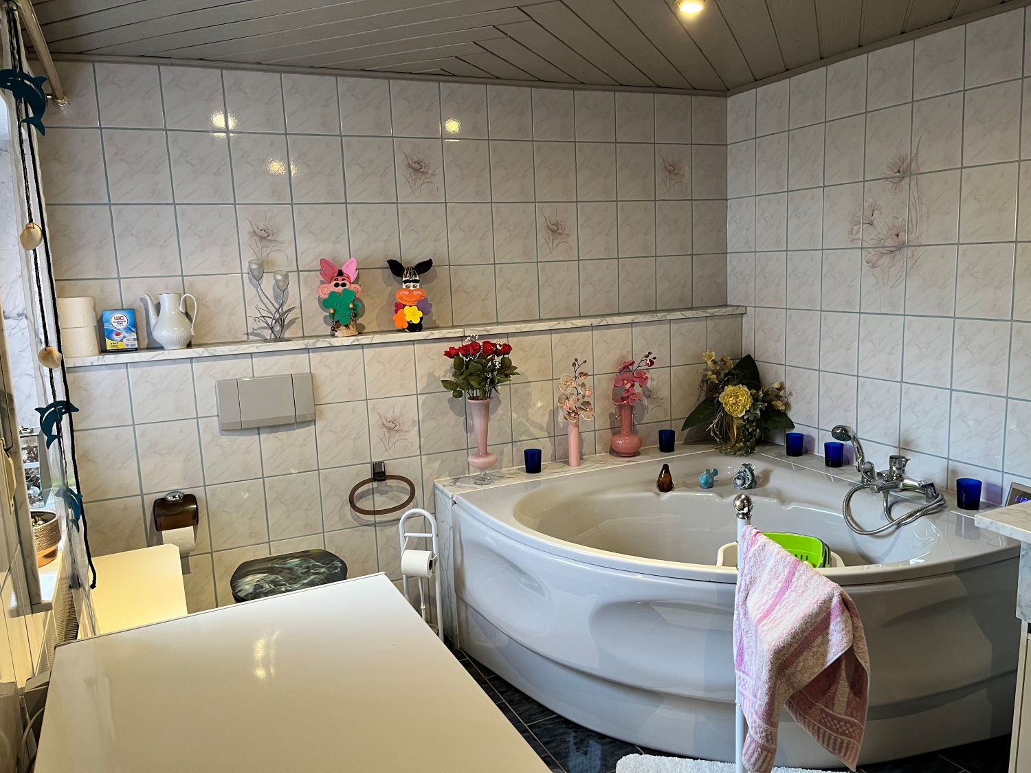 Im Erdgeschoss befindet dich ein ca. 23,30 m² großes Wohnzimmer, eine Küche Bad mit Wanne, Waschküche und Garage, im Obergeschoss sind dann das Schlafzimmer, zwei Kinderzimmer, eine weitere Küche und ein Bad mit Dusche sowie ein ca. 35 m² Wohnzimmer.